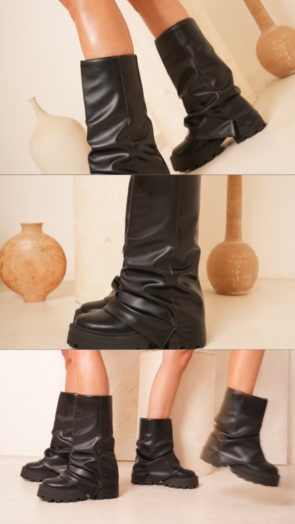 La bota que transforma cualquier look. Con efecto arrugado (slouchy) y base chunky, es el equilibrio perfecto entre comodidad y tendencia.