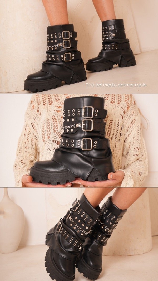 Borcego estilo biker con múltiples hebillas y detalles metálicos que lo convierten en un modelo protagonista. Un diseño fuerte, moderno y versátil que eleva cualquier outfit.